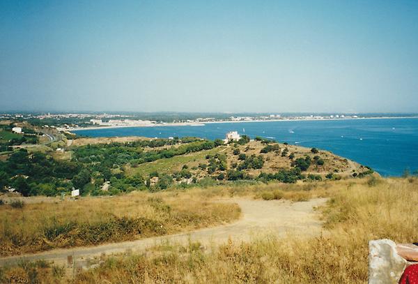Depuis la plage de port d'Avall, vue vers le nord sur l'entrée du port, la plage Saint-Vincent, l'église Notre-Dame des Anges et l'ancien phare. A gauche, le château royal et fort Miradou au fond.